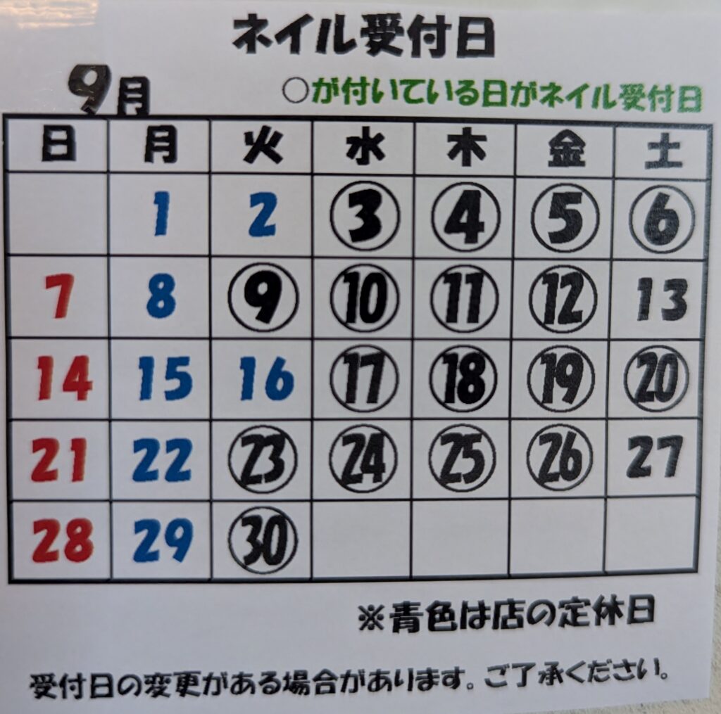 9月のネイル受付日です(*^_^*)